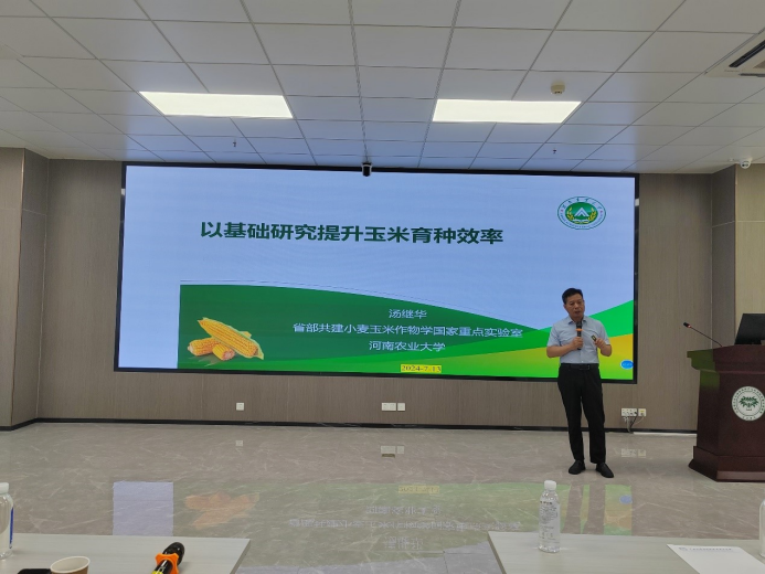 Professor Tang Jihua made an academic report entitled "Improving Maize Breeding Efficiency by Basic Research". The presentation focuses on the current situation and breeding target of maize production in China , the discovery of key genes of maize important traits and the basic research to promote the improvement of breeding efficiency. Professor Tang Jihua deeply analyzed the direction and advantages of future maize variety breeding, and encouraged the students to closely combine classroom learning, scientific research and social practice to contribute to rural revitalization.