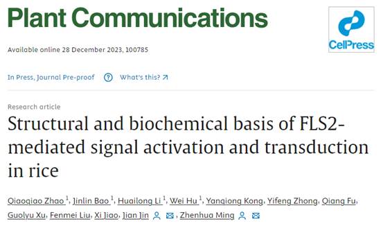 2023年12月28日,beat365在线唯一官网明振华团队和金健团队合作在Plant Communications在线发表了题为Structural and biochemical basis of FLS2-mediated signal activation and transduction in rice的研究论文。该论文解析了水稻中鞭毛受体激酶OsFLS2胞内激酶区的晶体结构,并提出了水稻OsFLS2通路的顺序激活模型。