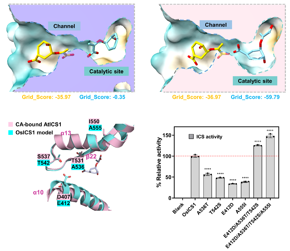 研究者同时发现,酶分子的催化中心与溶剂之间有一个长通道,底物穿过通道到达活性位点需要克服较高的能量屏障。分子对接和突变体实验结果表明长通道中存在一个可以结合底物的关键位点,底物与该位点的瞬时结合可以降低其穿过长通道的能量消耗,最终提升进入催化活性位点的效率。基于这些发现,研究者对低催化活性的水稻ICS1进行了理性设计,成功提高了其催化活性。