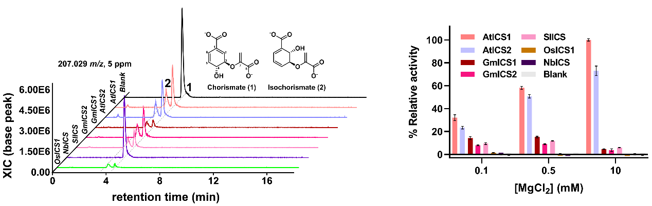 该研究通过LC-HRAM-MS实验发现拟南芥、水稻、大豆和番茄等植物的异分支酸合酶ICS1可以催化底物分支酸异构化生成产物异分支酸。酶活检测表明植物ICS1的催化过程具有镁离子依赖性,拟南芥ICS1的催化活性最高,水稻ICS1活性极低,烟草ICS1蛋白没有检测到催化活性。