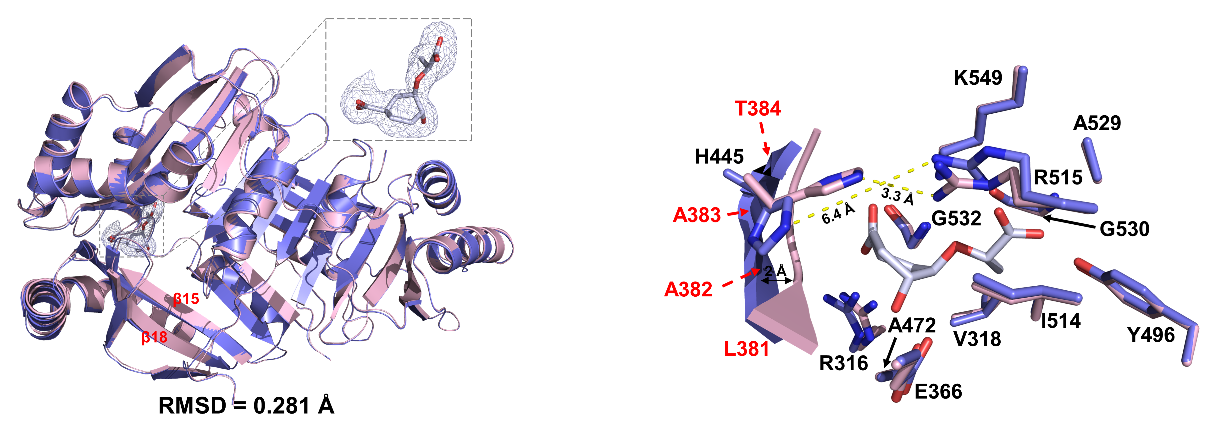 为了阐明植物ICS1蛋白的催化机理,研究者解析了拟南芥ICS1及其与底物分支酸的复合物晶体结构。结构分析鉴定了ICS1用于底物识别和催化的关键氨基酸残基,突变体酶活实验表明这些氨基酸在ICS1催化过程中发挥重要作用。