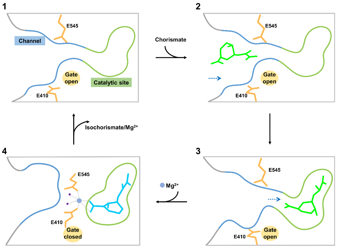 进一步的结构比对发现,植物ICS1在催化反应前可能形成一个封闭的反应口袋。研究者于是分析了这类口袋的形成条件,并提出了ICS1催化的门控调节模型:底物分支酸结合前,ICS1处于静息状态。此时参与门控调节的两个关键的谷氨酸残基相距较远,催化口袋处于开放状态。ICS1利用通道瞬时结合底物分支酸,可以帮助底物高效地穿过通道,抵达活性中心。随后镁离子协同参与门控调节的两个谷氨酸封闭通道,形成闭合的催化口袋,确保酶分子可以有效催化分支酸的异构化。产物异分支酸形成后通道重新打开,产物释放,ICS1回到最初的静止状态,完成一个催化循环。