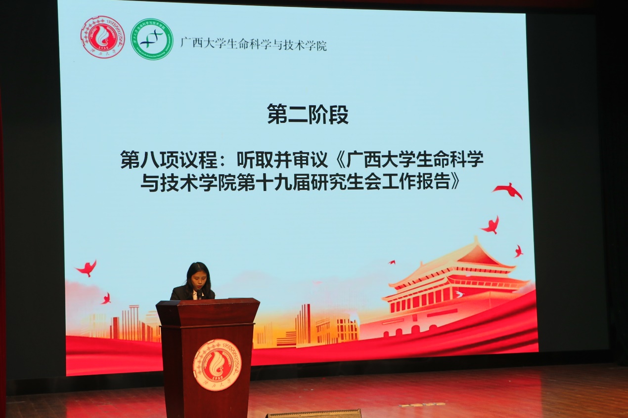 曾海艳老师讲话结束后,会议进入第二阶段。我院第十九届研究生会执行主席黄椿苓作题为《牢记青年使命,肩负时代担当,为学院发展与建设贡献青春力量》的工作报告。报告对上一届研究生会的工作成绩与经验、存在问题与不足做了全面总结,并提出了今后一段时期工作的总体思路和努力方向。