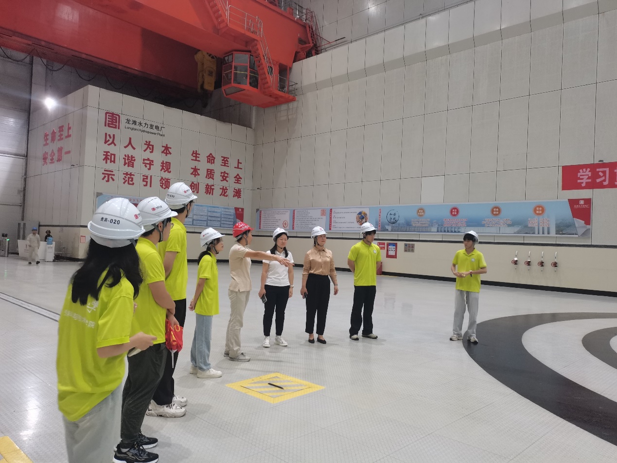 7月19日,实践团来到了天峨龙滩水电站,并在技术人员的带领下参观了地下发电厂房,实地了解了水轮发电机组的运作原理、发电过程和发电效率。龙滩水力发电站是红水河梯级开发的龙头骨干控制性工程,是国家实施“西部大开发”和“西电东送”的战略标志性工程之一,是中国大唐集团装机容量最大的水电厂。龙滩水电站以其巨大的装机容量和出色的发电能力,为广西乃至全国的经济社会发展提供了源源不断的清洁能源,有力促进了绿色低碳转型和边疆民族地区经济发展。通过参观龙滩水电站,实践团成员们进一步增长知识、拓宽视野,了解到因地制宜大力发展水电,对于修复生态、防范灾害、水资源综合利用、促进经济增长等方面都发挥了重要作用,更感受到了我国在能源领域中取得的巨大成就。