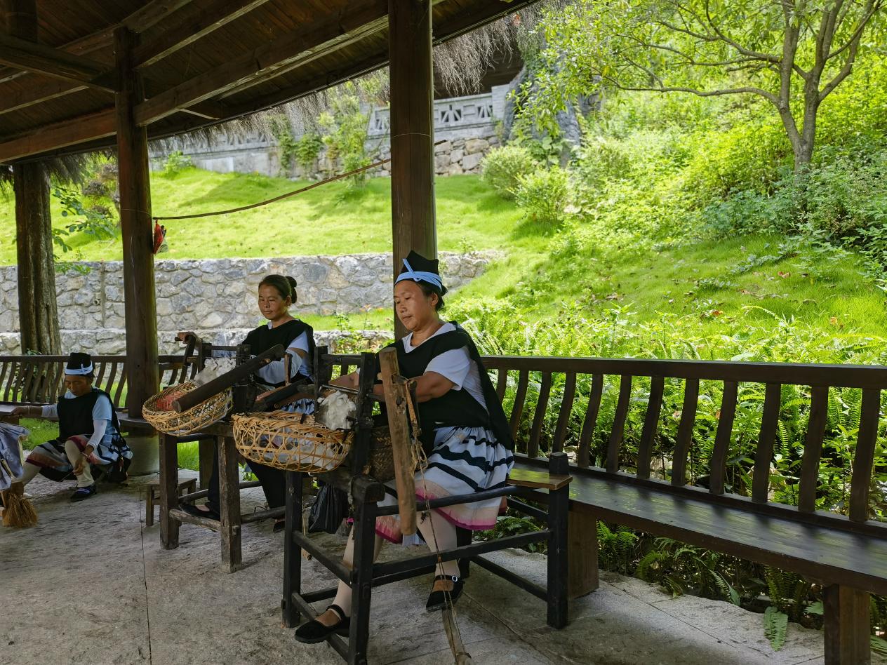 7月18日上午,实践团前往南丹县里湖瑶族乡白裤瑶寨开展民族团结进步教育活动。白裤瑶寨是一个展现广西白裤瑶族生产生活场景、没有围墙的活态实景博物馆。寨子里设有白裤瑶非遗服饰制作技艺展示平台,当地白裤瑶妇女现场展示列入国家级非物质文化遗产名录的白裤瑶服饰纺织工艺和制作工艺。实践团一行参观了白裤瑶寨的博物馆展厅,学习了解了白裤瑶绚丽悠久的民俗文化和自强不息的民族精神,坚定了青年学子的文化自信,更进一步铸牢中华民族共同体意识。随后实践团前往白裤瑶易地搬迁点——朵努社区进行现场调研,亲身感受白裤瑶聚居地发展的新面貌、新成就,深切体会到了民族团结与乡村振兴同频共振的累累硕果。