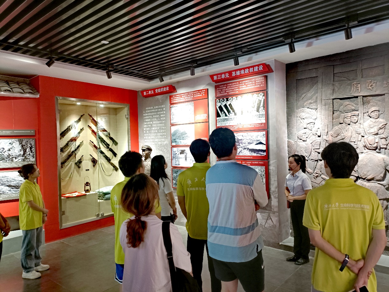7月19日下午,实践团前往岜暮乡都楼村纳朗屯红色教育基地,聆听革命故事、缅怀革命先烈、传承革命精神。基地划分为“岜暮农民运动、党组织建设、苏维埃政权建设、根据地建设、军队建设和武装斗争、英雄人物介绍”六个部分,展馆里的一幅幅油画、一个个雕塑、一件件实物,回顾了岜暮苏区党组织、苏维埃政权和根据地的建设过程、见证了革命先烈三次反“围剿”斗争的过程,记录了1932年秋的甘孟战役和拉号岩九壮士的英雄事迹。通过走进红色教育基地,大家接受了一次深刻的革命传统教育和党性洗礼,进一步坚定了理想信念,赓续红色血脉,汲取奋进力量。