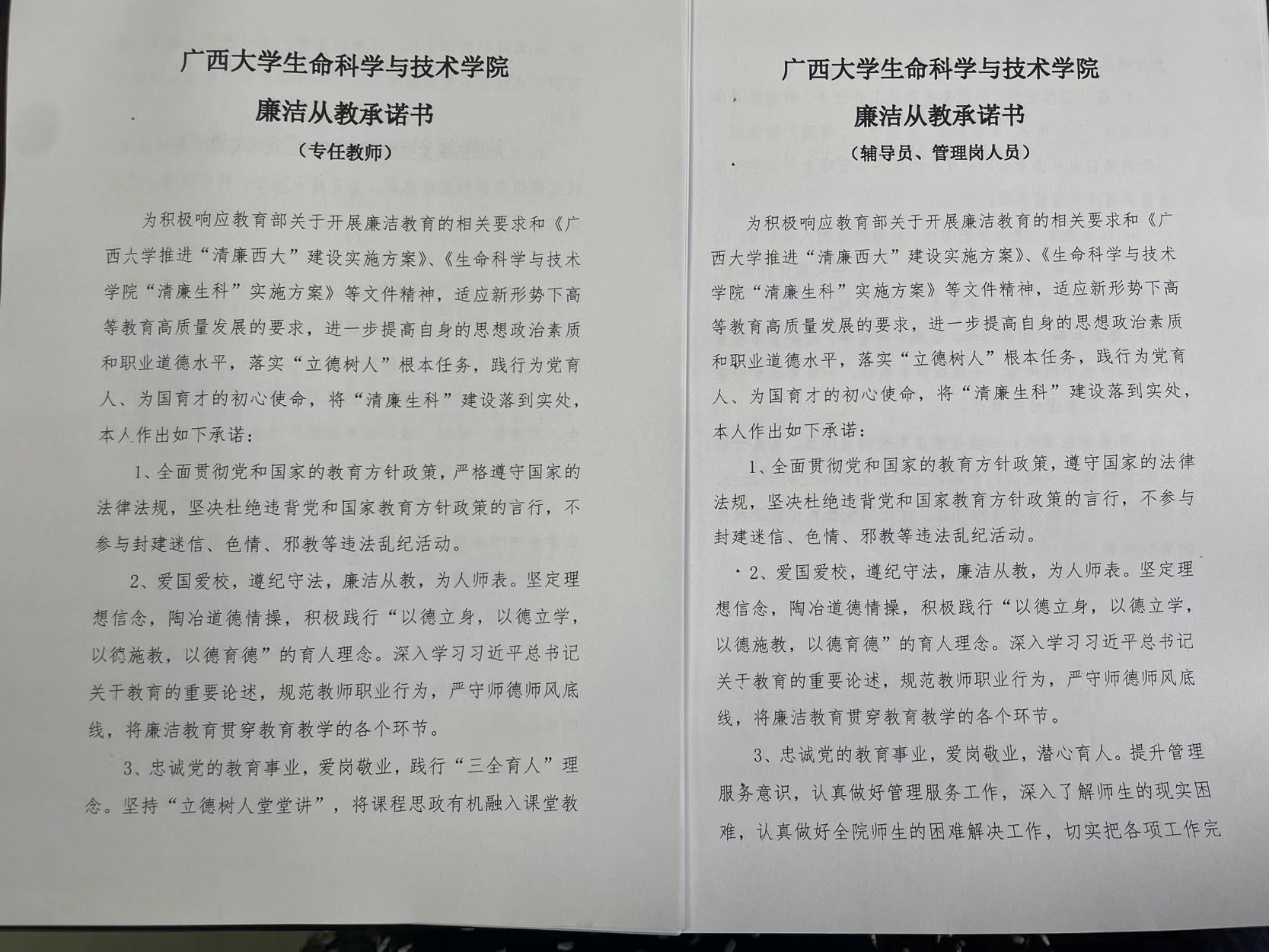 为积极响应教育部关于开展廉洁教育的相关要求和《广西大学推进“清廉西大”建设实施方案》、《beat365在线唯一官网“清廉生科”实施方案》等文件精神,11月22日,我院组织全院教师在学院106开展以“廉洁从教”为主题的师德师风承诺签名活动。