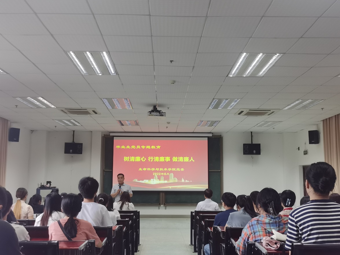 一、面向全体毕业生党员开展专题教育。6月23日,我院党委书记莫柏林给全体毕业生党员作题为“树清廉心、行清廉事、做清廉人”的专题教育。莫书记带领全体毕业生党员一起学习廉政知识,强调党员责任与义务,号召全体毕业生党员树清廉之心、行清廉之事、讲正义之气,担当作为,积极营造清正校园风尚和廉政文化氛围,为学校“双一流”建设和“十四五”规划的实施作贡献。