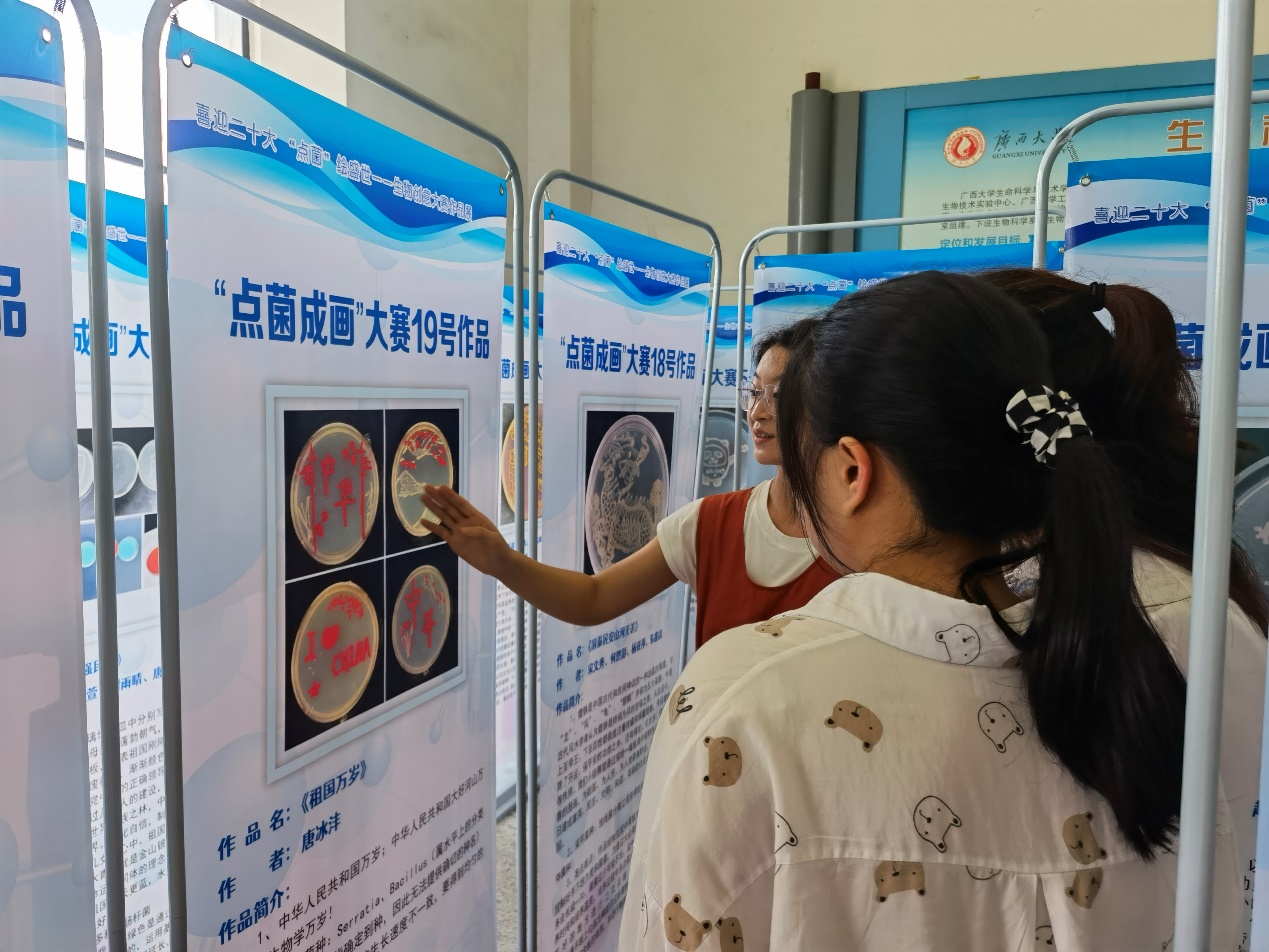 三、结合学科特点,举办“点菌成画”微生物创意作品绘画大赛。大赛以“喜迎二十大、永远跟党走、奋进新征程”为活动主题,鼓励学生发挥所学,利用各类细菌或真菌,在培养基上进行绘画创作。通过举办本次比赛,一方面厚植了学生的爱国主义情怀,营造了良好的文化氛围;另一方面也在全院范围内营造了浓厚的学科学、爱科学、用科学的科技创新氛围。