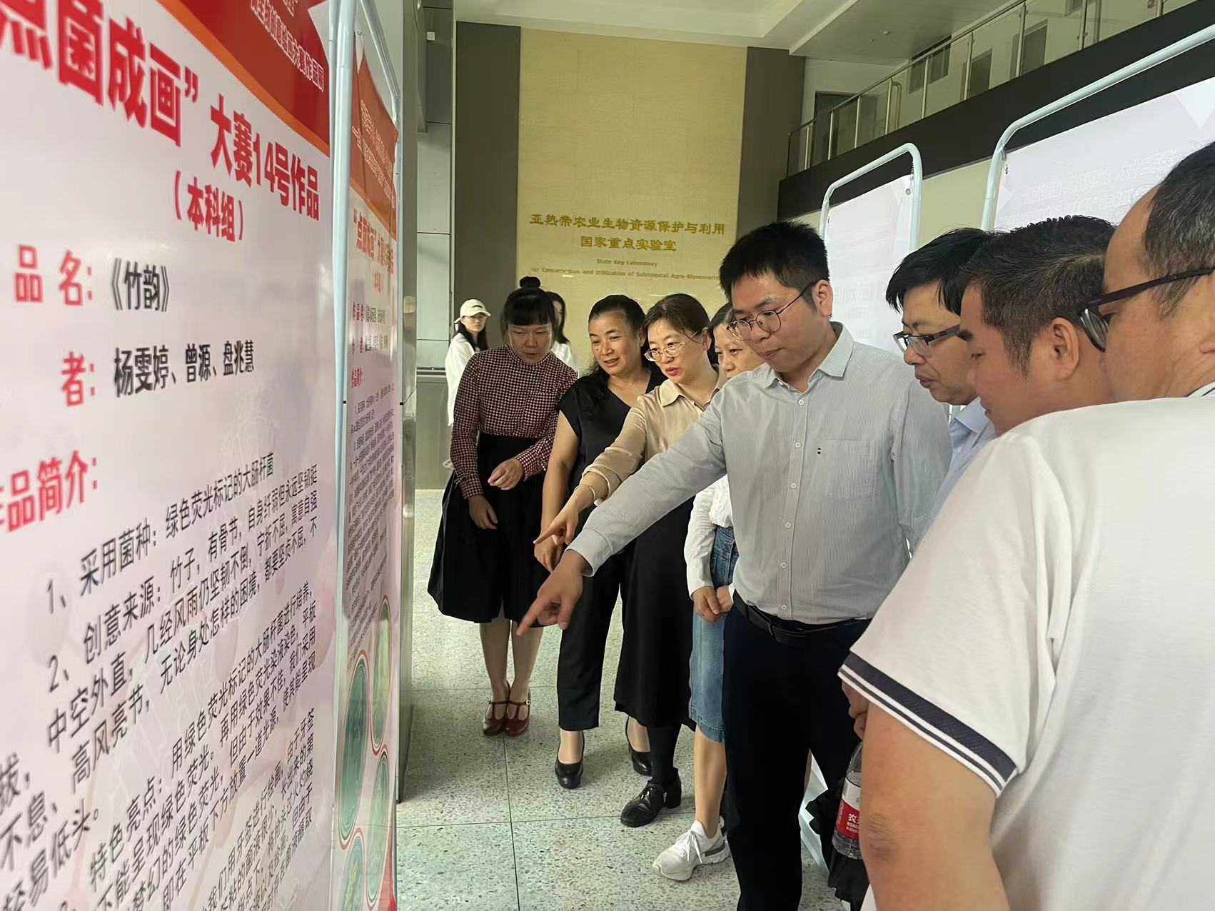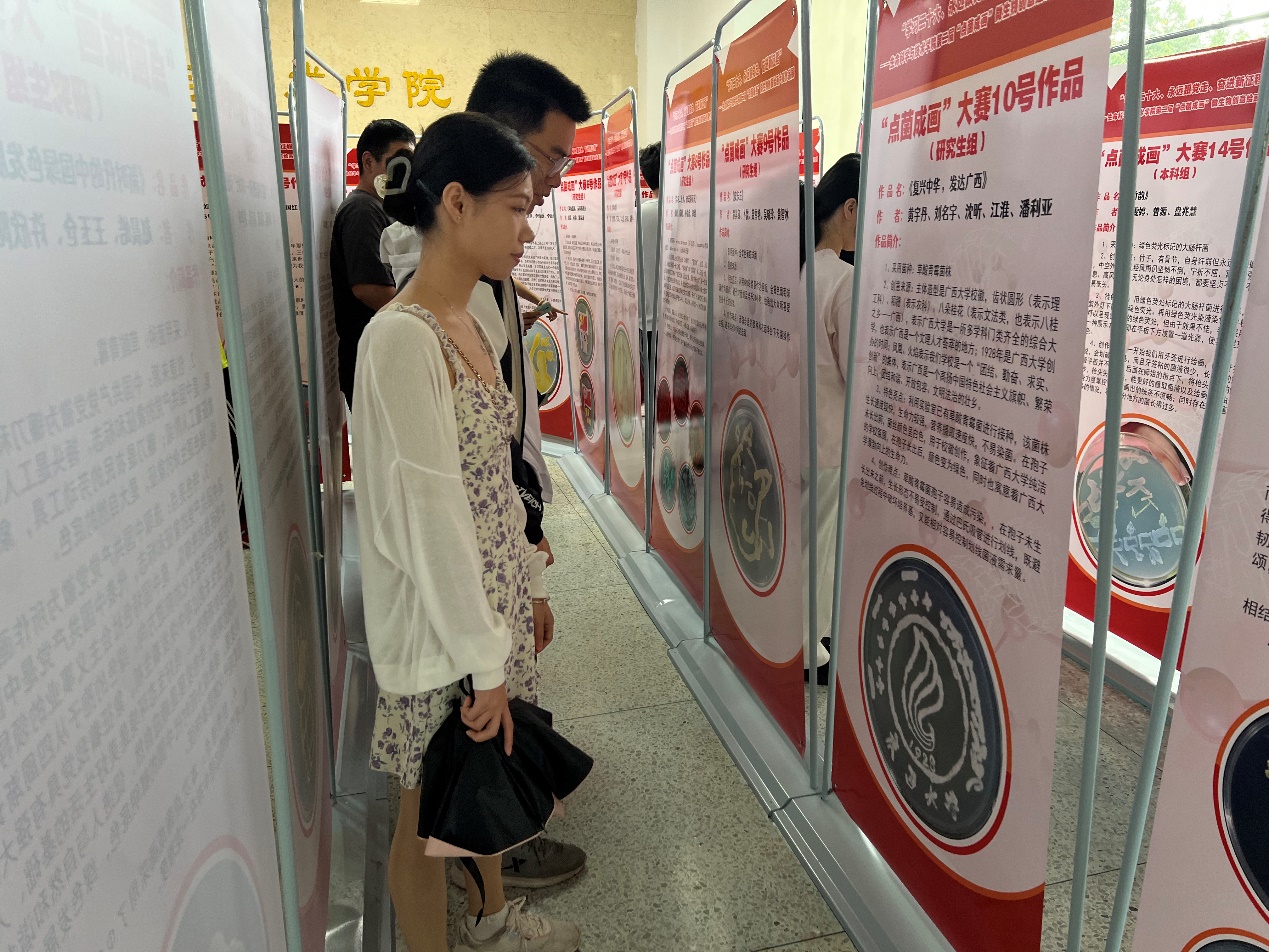 开幕式结束后,与会师生在学院大厅观看“点菌成画”展览。“点菌成画”活动是本次科技学术节的重要子活动,选手们根据自身的实验室条件,选择适合的细菌或真菌,围绕“学习党的二十大精神”、“听党话、跟党走、感党恩”、“赞美祖国”等主题进行创作。选手们选取了黄单胞菌、十字花科黑腐病菌、大肠杆菌、毕赤酵母、草酸青霉、金黄色葡萄球菌等菌种在培养基上作画,绘制中国地图、国旗、国徽、党旗、党徽、团旗、团徽、祖国山河、中国取得的重大科技成就、抗疫工作人员等内容。参赛作品紧紧围绕主题,展示了中国共产党团结和带领全国各族人民找到了实现中华民族伟大复兴的正确道路,实现了民族独立、人民解放,实现了国家富强、人民幸福;表达了新时代大学生永远听党话、感党恩、跟党走的坚定信念;赞扬了中华民族形成的以爱国主义为核心的伟大创造精神,伟大奋斗精神,伟大团结精神,伟大梦想精神。这些作品既是生科学子对所学知识的实践运用,也是他们对党和祖国热爱的表现。