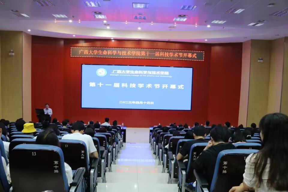 4月15日上午9时,我院在圆形报告厅隆重举行本届科技学术节开幕式。学院党委书记莫柏林、党委副书记、常务副院长李有志、党委副书记曾海艳、副院长李伟辉、院长助理陈玲玲、院长助理卢洁、生物科学系主任李楠、团委书记周嫱老师、团委副书记马奕、辅导员俸雪、兄弟学院学生代表邓雅宁及我院300余名学生代表出席本次活动。