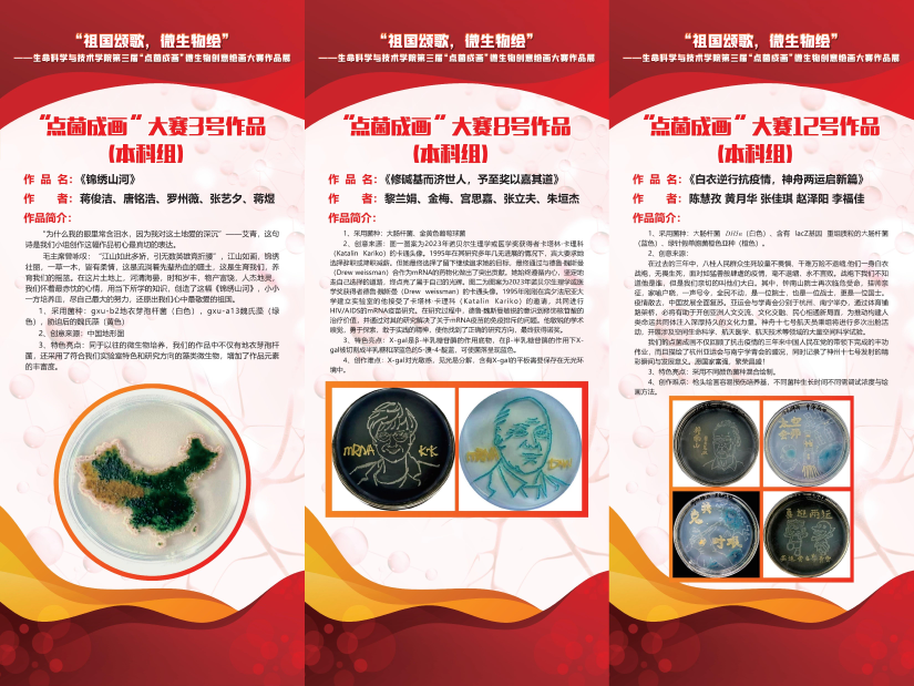 “点菌成画”微生物创意绘画大赛作为本届科技学术节的重要子活动之一,共吸引了35支队伍参赛,累计收到参赛作品70余幅。各参赛团队紧密围绕主题,结合微生物专业知识、实验操作技能与创造力和想象力,以培养皿为画布,以接种环为画笔,以大肠杆菌、金黄葡萄球菌、十字花科黑腐病菌、毕赤酵母、草酸青霉等微生物菌种作颜料,通过科学运用微生物的生理特征、生长繁殖和培养技术等专业知识,以及娴熟的操作技能和丰富的想象力,将科学之思与艺术之美相互结合,创作出一幅幅匠心独运、画风精美的微生物画作品,描绘出了生科学子热爱伟大祖国,矢志投身基础学科的远大志向。