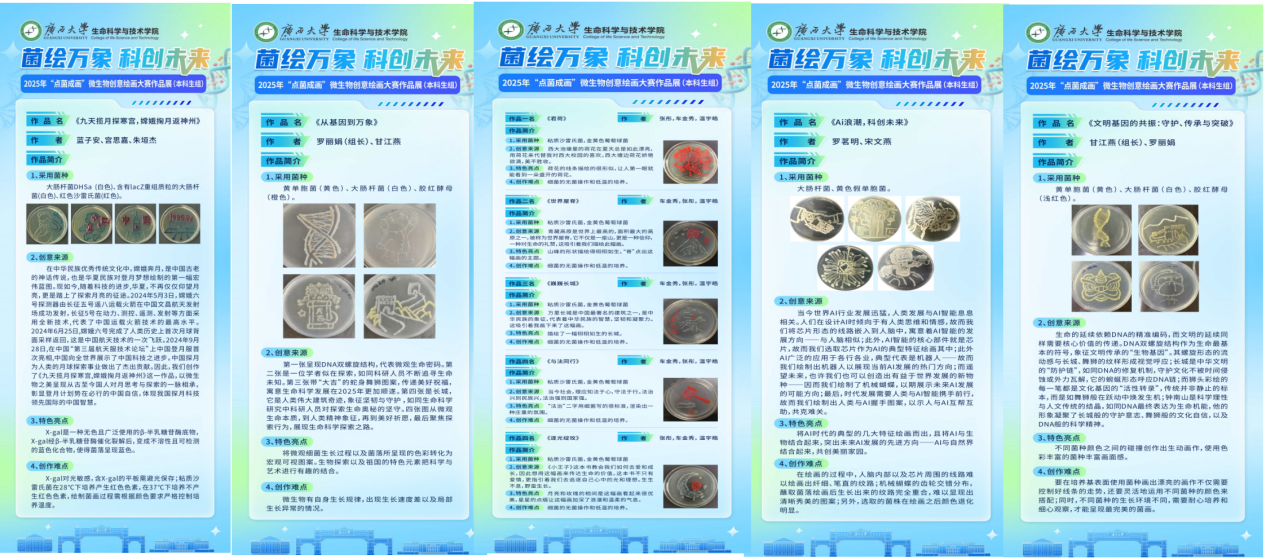 本届“点菌成画”微生物创意绘画大赛共收到223份参赛作品。各参赛队伍依托实验室提供的场地和条件,以非致病性微生物为颜料,在培养基上创作出一幅幅富有生命力的艺术作品,主题涵盖了青春梦想、人工智能、未来科技等多个方面,展现了生科学子对科学研究的热爱和对未来发展的无限憧憬。在这些参赛作品中,既有体现生物制造前沿理念的创新设计,也有歌颂祖国大好河山的美好画卷。经过最终评审,本科生组共评选出一等奖作品5项,研究生组共评选出一等奖作品41项。