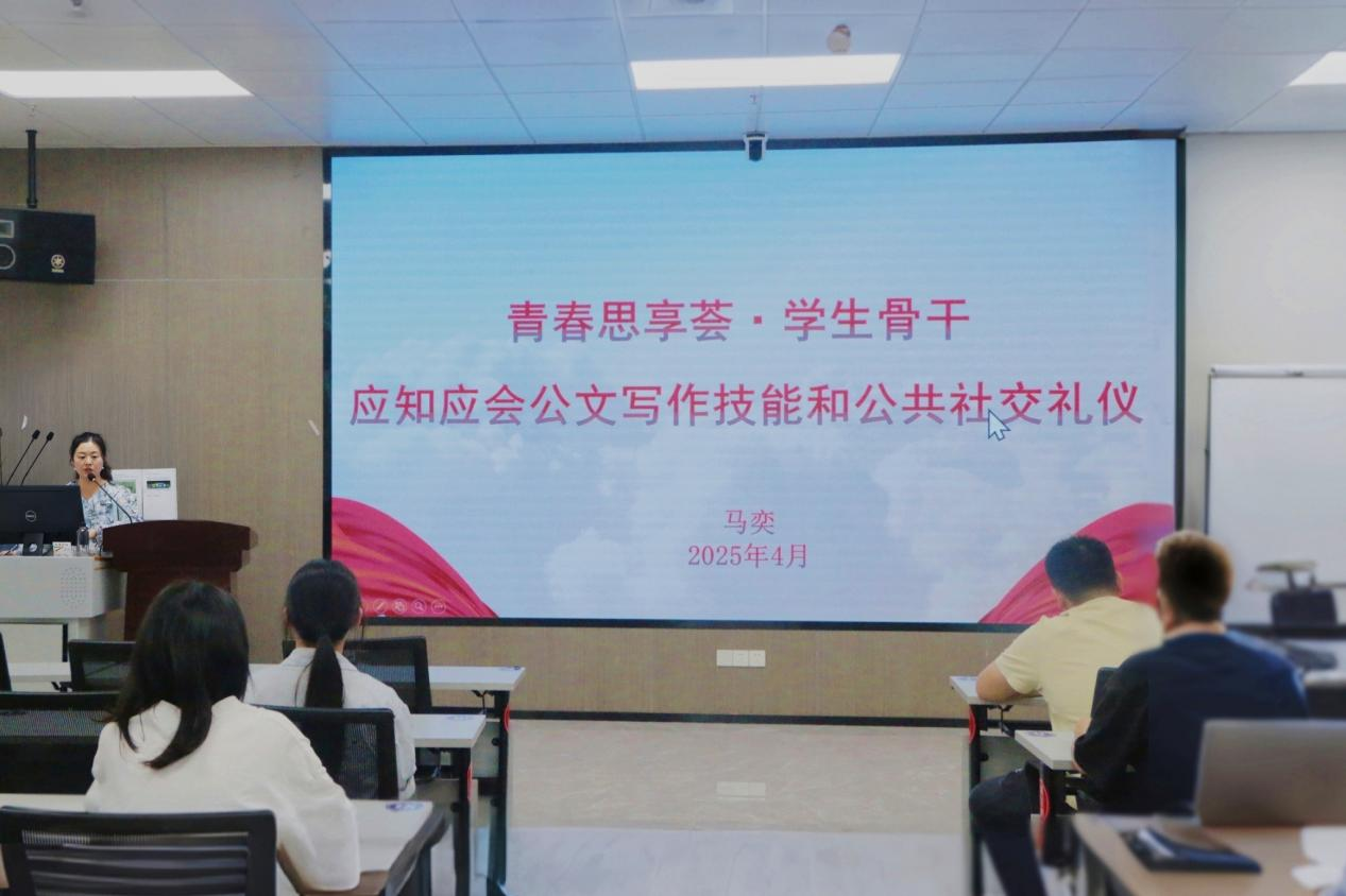 4月17日,马奕老师在《应知应会公文写作技能和公共社交礼仪》专题培训课上,详细阐述了各类型文书的结构、写作方法与注意事项,帮助学生骨干掌握公文写作规范,提升写作能力和水平。同时,她详细介绍了仪表、会面、交谈、集会、电话与网络礼仪等方面的内容,提出学生骨干要注重加强公共社交礼仪意识,树立良好形象,展现优良风貌。